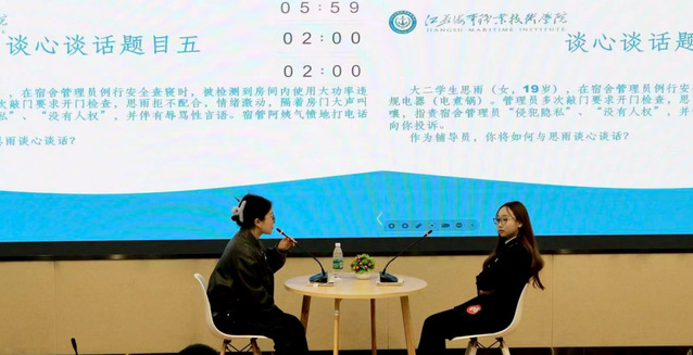 谈心谈话环节侧重于考察辅导员对学生成长规律的把握与思想引导的实际能力。选手通过情景模拟,再现学生日常互动。比赛中,辅导员们耐心倾听、循循善诱,既注重思想引导,又体现人文关怀,充分展现了“以学生为中心”的工作理念与扎实的沟通技巧。