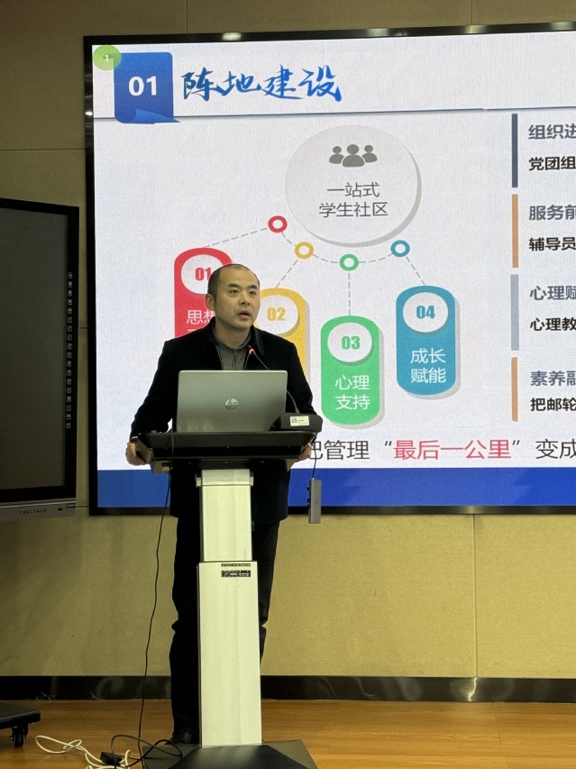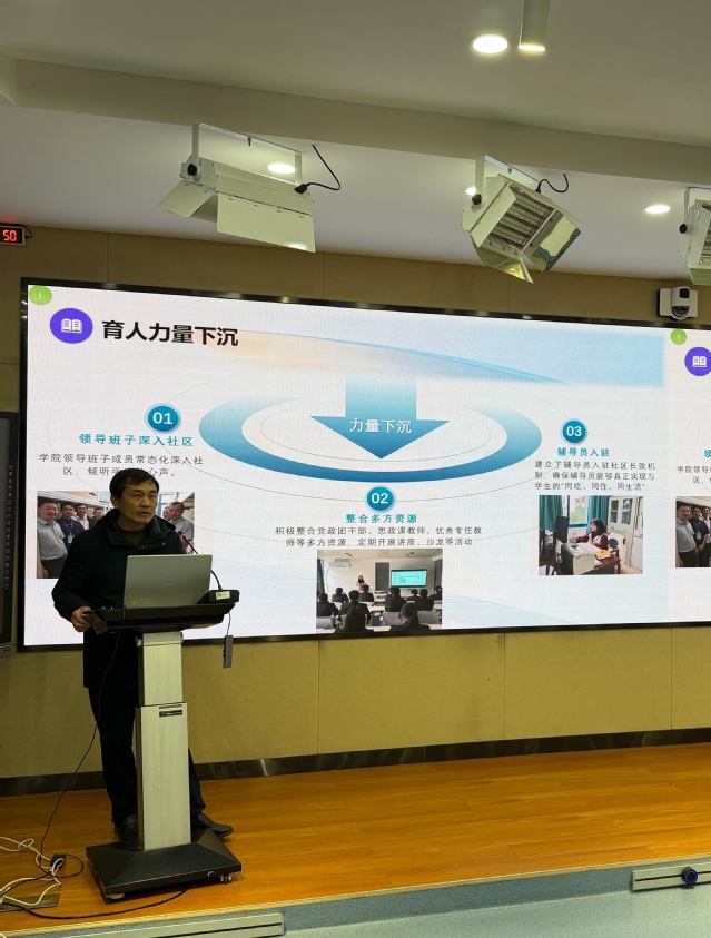 会上,各二级学院党总支副书记围绕“一站式”学生社区建设核心目标与实践路径,依次作交流汇报。学工处处长王利成认真听取各部门汇报,对各二级学院“一站式”学生社区建设工作与未来规划给予充分肯定。他指出,“一站式”学生社区是落实“三全育人”理念的重要载体,是打通育人“最后一公里”的关键抓手,关乎学生成长成才与学校育人事业高质量发展。自2023年启动“一站式”学生社区建设以来,已实现学生社区文化建设落地、硬件配备到位、育人力量全面下沉三大工作成效。