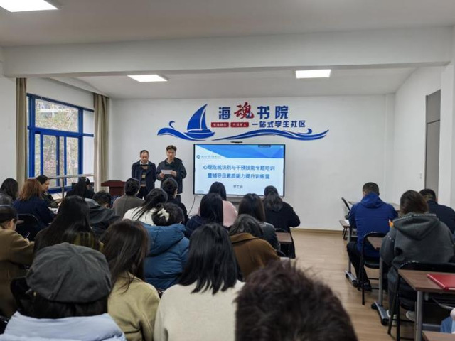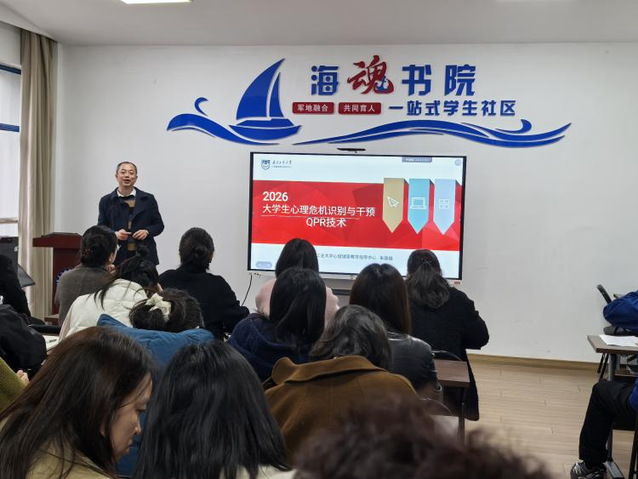 为全面提升我校辅导员心理育人专业化水平,守牢校园心理健康安全底线,3月24日下午3:30,学工处在国防学院一站式学生社区举办了以“心帆领航・护航海院:辅导员心理危机识别与干预技巧”为主题的专题培训。本次培训特邀南京工业大学心理中心主任朱巍巍老师担任主讲,学工处相关老师、各二级学院全体辅导员参加了本次培训。